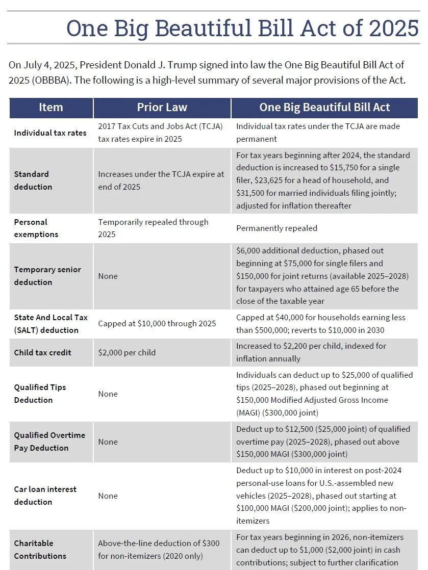 As we enter the second half of the year, one of the most consequential developments for individuals and businesses is the passage of the much-anticipated 2025 tax legislation—formally referred to as the Tax Relief for American Families and Workers Act, but popularly dubbed “One Big Beautiful Bill Act” (OBBBA).
